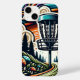 En golf basket och kurs i fält på retro-svampar, gräs träd och snabbt moln i vintage färg som orange, blått och grönt.