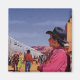 Vintagens illustration av resor och transport-bilden med ett lokomotiv vid tåg station i New mexico, där en man från Native Indian väntar på att besöka turister och andra resenärer.