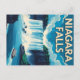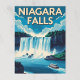 Ett klassiskt vintage resor poster fångar de mäktiga Niagara Falls, med två researrangörer som navigerar i det rasande vatten nedanför, allt under ett dynamiskt blå himmel med mjuka moln. "NIAGARA FALLS" visas på en framträdande plats överst.