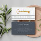 affärskorten för elegant för verkliga gods-bedömare eller utvärderingsföretag har en illustration av vintage nyckel med vattenfärg, med ditt namn eller namn under. Lägg till kontaktuppgifterna för fullt på motsatt sida i vitt på en kontrasterande rökfri blå bakgrund.