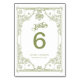Skicka dina gäster i stil med de vintage-inspirerade bordsnumren-korten. Med en mjuk oliv grönt bakgrund och ett delikatritat antika ram lägger de till en liten men polerad beröring till din décor i bröllop.