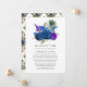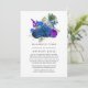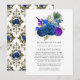 Elegant vintage marinblå och kunglig blå rosor reducerad bröllopsinbjudan med accenter av lila och guld i ett barock påfågel-tema. I dessa osäkra tider kan det hända att du måste hålla ett mindre bröllop än vad som ursprungligen planerats. Detta bröllopskort tar bort pinsamheten och tar en tyngd av din hjärna! Du kan dessutom ge möjlighet att delta i en virtuell ceremoni.