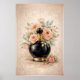 En förfinad vintage-inspirerad illustration med en elegant svart parfymflaska prydd med mjuka rosa rosor och delikat lövverk. Varma neutrala toner och en texturerad bakgrund skapar en romantisk, shabby chic komposition inspirerad av klassisk skönhet och blomster teman.