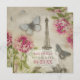 Anpassad Spara datum- bröllopsannons med chic Parisiskt franskt tema med en vintagekollage av Eiffeltornet i Paris, Frankrike, rosa pioner och romantiska fjärilar.