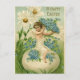 Det här vykortet har en vintage teckning av en körsbärare sitta på ett ägg och håller upp blåa blommor. Hon är omgiven av vita daisy. Njut av att skicka den här Vintagen Påsk Cherub med Blommor-vykortet till dina vänner och familj i Påsk-säsongen.