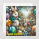 En vintagemålning av påskharen, omgiven av blanka påskägg och fyra små barn. Detta skulle vara ett bra kort för ett barn som älskar att samla på påskminnen. Det kommer att skapa lyckliga minnen. Utrymme för att skriva på baksidan av kortet under en mindre version av framsidans bild. Skapad med hjälp av BING.