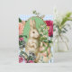 Vintagen ser ut som en kollage av en vit kanin med vår blommor och ägg. Påskharn är i bakgrunden av en stor grönt ägg och en baby blue ginghamcheck.