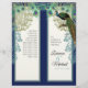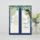 En elegant och ett billigt alternativ för ett bröllopsprogram måste du vika ihop de gångar som du får dem. Marin blå bakgrund och grönt med utsökt vintage-påse på ett märke omgivet av handmålade vattenfärgsfjädrar och etsad rulla blomstrar för ett vackert temat bröllop. Copyright.