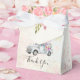 Bröllopsorkar eller andra evenemang med en vattenfärgillustration av vintagen boho stil. En gammal plocka upp lastbil med en blomkett i ryggen. En vacker bild med land flair. Söt bukett med rosor utmed övre gräns. Bakgrunden är en flod av vintage stil mönster.