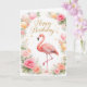 An elegant and joyful birthday card design featuring a graceful pink flamingo framed by a lush floral wreath. Soft watercolor roses, peonies, and greenery intertwine with pastel balloons and delicate gold accents, creating a light, airy composition. The refined gold script “Happy Birthday” adds a touch of sophistication, while the flamingo’s poised stance brings charm and personality.