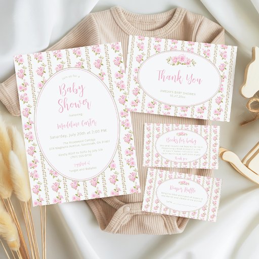 This wrapping paper features soft pink roses and gentle greenery in a classic vintage stripe design. The light, neutral background keeps the look clean, elegant, and versatile for baby shower gifts.