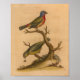 Vintage 1776 fågelillustration från Gleanings of Natural History. Grönt, röd och blå fågelfågel sitta vid träd gren.