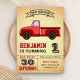 Förbluffa dina gäster med coolan 1:a födelsedag party inbjudan, med ett vackert rött lastbil med modern typografi mot en vintage parchmentbakgrund. Lägg bara till din händelseinformation i den här mallen som är enkel att använda för att göra den till en inbjudan av typen en. Vänd över kortet för att visa en rustik lingved struktur på baksidan av kortet.