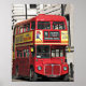 Bild har en vintage röd London Buss. En aning nostalgi och underbar design med den här bilden av det ljusröda bussen med reklam för musikaliska spel och målinformation.