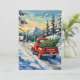 A timeless vintage Christmas illustration featuring a red pickup truck hauling a festive evergreen tree through snowy woods. A nostalgic holiday favorite.