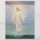 Vintage illustrerar religiösans kristendomen med ett av Jesus mirakel i New Testament, Jesus Kristus som går på vatten. Den unge mannen bär en lång rob och har en heliga halo eller aura runt huvudet medan han går över ett hav eller ett hav med glatt vinkar.