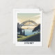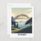 En stiliserad, vintage resor poster som skildrar Sydney Harbour, med den ikoniska opera House och Harbour Bridge under en mjuk, grumlig himmel.