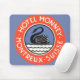 Vintage illustration Europaresor affisch eller resemärke från Hotel Monney, Montreux, Schweiz med cirkeldesign med en svan som simmar på en sjö. Hotel Monney, Montreux, Schweiz.