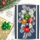 Det här vintagen innehåller ett sortiment av julprydnadsföremål som hänger på en flockad vergrespray. Ett band har en märkre som säger "Hälsning". Den blå bakgrunden gratulerar buskens grå färg och den gröna och ge en popo till den festliga färgen av julbalarna. Anpassa genom att anpassa meddelandet på baksidan och/eller lägga till ditt/dina namn.