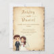 Den här elegantens inbjudan till bröllopet mellan bok och stil är perfekt för ett modernt bröllop. Den reflekterande utformningen har en illustration av vintagens brud och groom och svartfärgad kalligrafi på en tecknad med bok som tema.