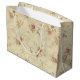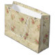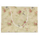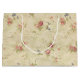 Bild i vintage textilväv med vacker röd ros på avklädd beige bakgrund.