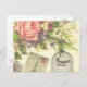 Ett vackert vintage bild med ett Victoriantema, med en fågel i bur, ett vykort för vintage från Paris och söt rosa ros.