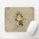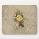 Riktigt texturerad utformning med en spray av vintage ro i gult och rosa med delikat graverad blommigt ornament på en tryckt vintage med linn tonad dammbakgrund.