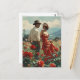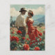 vykortet fångar en charmerande scen i ro fält. Mannen, förtrollad i det rustiska jordbruket, står vid sidan av kvinnan, vars sjudande röda klänning på ett vackert sätt står i kontrast till lush-omgivningarna. Den levande blomman skapar en bildbakgrund och ställer in scenen för ett tidslöst ögonblick som fryses i den här vintagen.