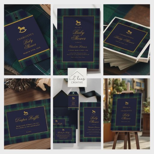 Celebrate your little one with this beautifully designed classic baby shower napkin featuring a rich plaid border and a charming rocking horse illustration. With its elegant typography and traditional style, this design is perfect for a refined, cozy, and timeless baby shower theme.
