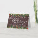Rustic christmas-kort med vikande hälsningar med mörk träbakgrund, festive julgran grenar, red & guld träd dekoration, string twinkle ljus, ordspråket "glad helg" och din familj namn.
