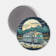 Söt ai-konst med en retro-kamper som kör genom bergen med nostalgiska vintage camping-vibes.