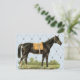 Handsome black horse with sadelle in fullt färg vintage illustration on light blue mönster bakgrund