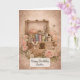 A charming vintage-style illustration featuring an open wooden sewing box filled with colorful spools of thread, scissors, and sewing tools. Surrounded by soft pink roses and delicate flowers, the composition is set against an aged, textured background that enhances the nostalgic and shabby chic aesthetic.
