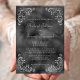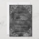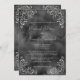 Den här vintage-inspirerade bröllopsinbjudan innehåller texten i blek silver grått-skript och serif typsnitt, som är framtagen av en delikat vintage silver foliage-motiv i fyra hörn på en svart vattenfärgsbakgrund. Bakgrunden till ram och vattenfärgen upprepas på motsatt sida.