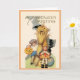 En vintage Halloween-kortbild har två barn, jack-o-lyktor och ett veteskikt i fält. På kortets framsida står "Halloween Hälsning" och på baksidan på kortet står: "Sjungan sång i Halloween, Pumpkins överallt, Katt, fladdermus och häxor flyger genom luft."