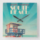 Retro Miami South Beach-konstruktionen med en stars och stripes-livräddningshut i rött vitt och blått på södra Beach:s sand mot ett blå himmel med vintage