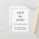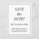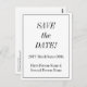 På framsidan av den här vintagen och det klassiska utseendet på vykortsdesignen är meddelandet "SPARA DATE!", tillsammans med anpassat namn, ett datum och händelseinformation. Sådana vykort skulle kunna användas för att informera potentiella gäster om ett kommande bröllop firande eller något annat evenemang.