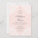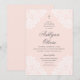 En elegant dopinbjudan med mjuka vita spetskantar på en rosafärgad bakgrund.