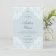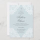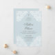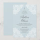 En elegant dopinbjudan med mjuka vita spetshörn på en mjuk himmelblå bakgrund.