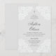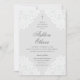 En elegant dopinbjudan med mjuka vita spetskantar på en mjuk neutral grå bakgrund.