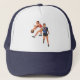 Vintageillustration sport basketboll bild med lagspelare som spelar en match. En man dribblar bollen och hoppar upp för att göra det vinnande målet!