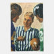 Vintage illustrerar fotbollsbilden med två fotbollsspelare och den domare som håller boll på att slunga ett mynt för att se vem som startar fotbollsmatchen. Dags att spela boll!