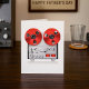 Stereos har kom långt ifrån hur de brukade vara. Den här designen är en coola vintage stereo. Den har två stora bandrullar högst upp. Den här vintagens stereodesign ser underbar ut på de här hälsningskorten