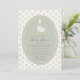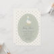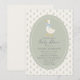 Sweet and timeless baby shower invitation featuring a charming storybook-style goose illustration with a soft blue bow, set inside a delicate scalloped frame. The gentle sage green center and tiny floral background create a romantic cottage-inspired look that feels warm, nostalgic, and beautifully refined. Classic typography and a balanced layout give this design an elegant, heirloom-quality feel perfect for a special celebration.