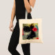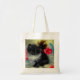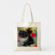 Tote Bag med en lekfull svart och vit kattunge! Den här fluffy tuxedo-katten kastar in röda blommor på en blå filt. En fantastisk gåva till kattälskare och Viktorianska konstentusiaster!
