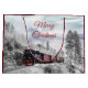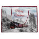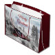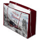 En stor presentsäck med ett foto av ett vinterlandskap i isigen med snö-täckt gräs träd. Ett rött, guld och svart gammaldags tåg som färdas genom vildmarken.