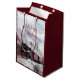 En presentsäck med ett foto av ett vinterlandskap i isig med snö-täckt gräs träd. Ett rött, guld och svart gammaldags tåg som färdas genom vildmarken. God jul i ett rött kalligrafteckensnitt.