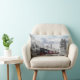 En kudde med ett foto av ett snövildslandskap med snö täckt gräs träd. Ett rött, guld och svart gammaldags tåg som färdas genom vildmarken. Förtrollar tanken på att komma hem till jul.