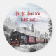 En magnet som säger (redigerbart om du vill ändra dig) att jag kommer hem till jul. Illustrerad med ett foto av ett snöslandskap med snö täckt gräs träd. Ett rött, guld och svart gammaldags tåg som färdas genom vildmarken. Förtrollar tanken på att komma hem till jul.