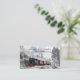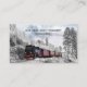 Jul-affärskort med ett foto av ett vinterlandskap i isigen med gräs träd som täckts av snö. Ett rött, guld och svart gammaldags tåg som färdas genom vildmarken.